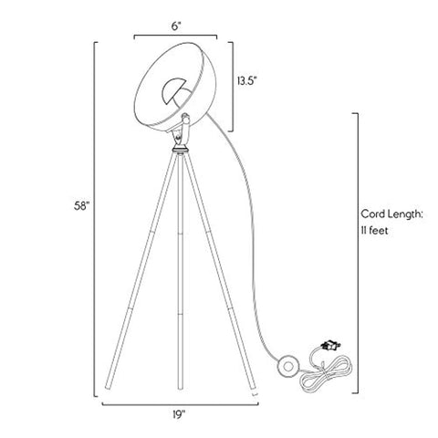 DIMENSIONS: Floor Lamp: 58" (H) x 19" (W) x 19" (L), Shade: 13.5" (D) x 6" (H), Cord Length: 11 feet. Dimmer, wall switch, timer and smart plug compatible